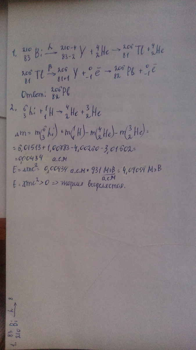 2)При бомбардировке протонами ядра атома изотопа лития с массовым числом 6 выбрасываются два разных изотопа гелия. Напишите уравнение ядерной реакции и определите энергию реакции. Поглощается она или выделяется? Массы ядер взять из справочных данных.