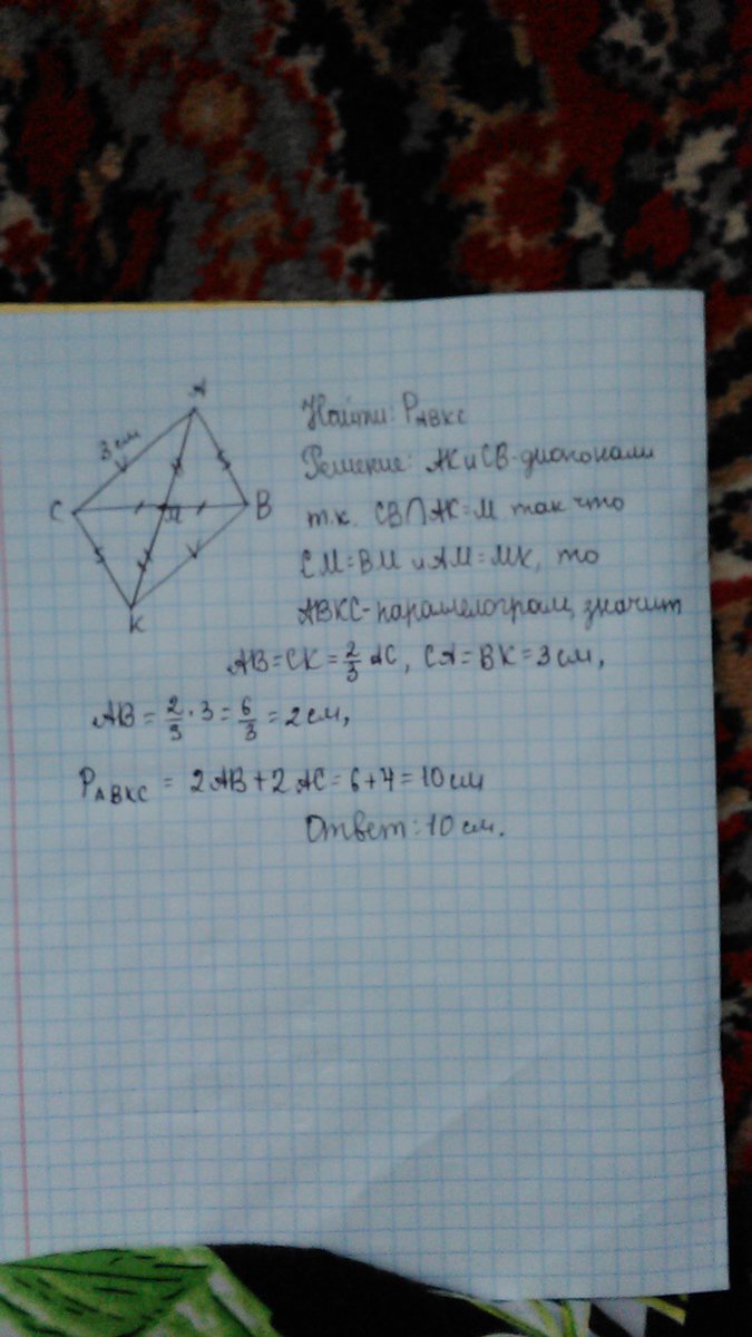 На рисунке медиана AM треугольника ABC продолжена за точку М на отрезок МК , равный медиане . Пусть отрезок AB составляет 2/3 отрезка АС , а отрезок АС равен 3 см. Найдите периметр четырёхугольника ABKC.