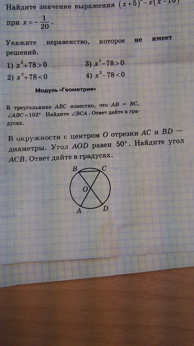рассмотрим треугольник BOC. Сумма градусник мер углов треугольника равна 180. 180-50=130 130÷2=65