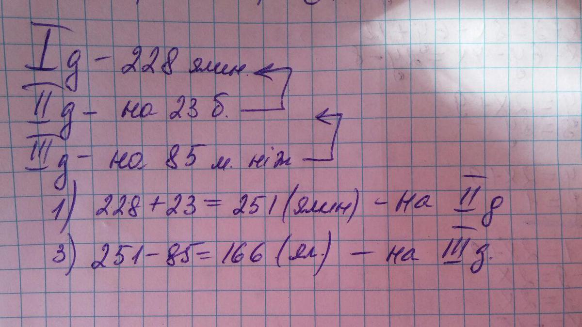 на першиц делянци 228 ялин„ на другий 23ялини бильше ниж на перший а на третий на 85 ялин меньши ниж на другий скильки ялин на третий дилянци?