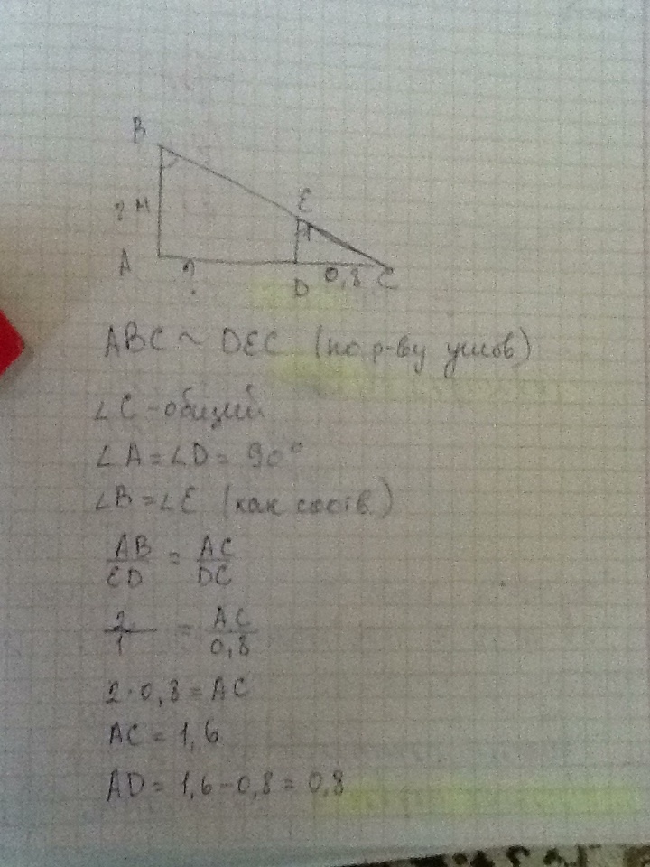уличный фонарь установленный на столбе высотой 2м. Вертикальный шест высотой 1м, постанвленный недалеко от фонаря, отбрасывает тень длиной 0,8м. На каком расстояние от основания фонарного столба поставлен шест?
