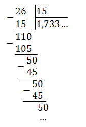 пишем 1 под 15, потому что 15 × 1=15, если мы возьмём 2 (15×2=30), то оно нам не подойдёт. Нам нужно чтобы число 26 можно было отнять поэтому нам подходит 15, отнимаем получается остаток 11, ставим запятую, так как нет больше цифр после 26 и пишем 0 к 11, получается у нас 110. Теперь опять так же подбираем число к 110, чтобы получить остаток, нам подходит 7, пишем в правый столбик и 7 умножаем на 15, число это отнимаем от 110 и опять пишет остаток и добавляем 0. Принято брать 3 числа после запятой, поэтому можно много не считать достаточно будет 1,733.