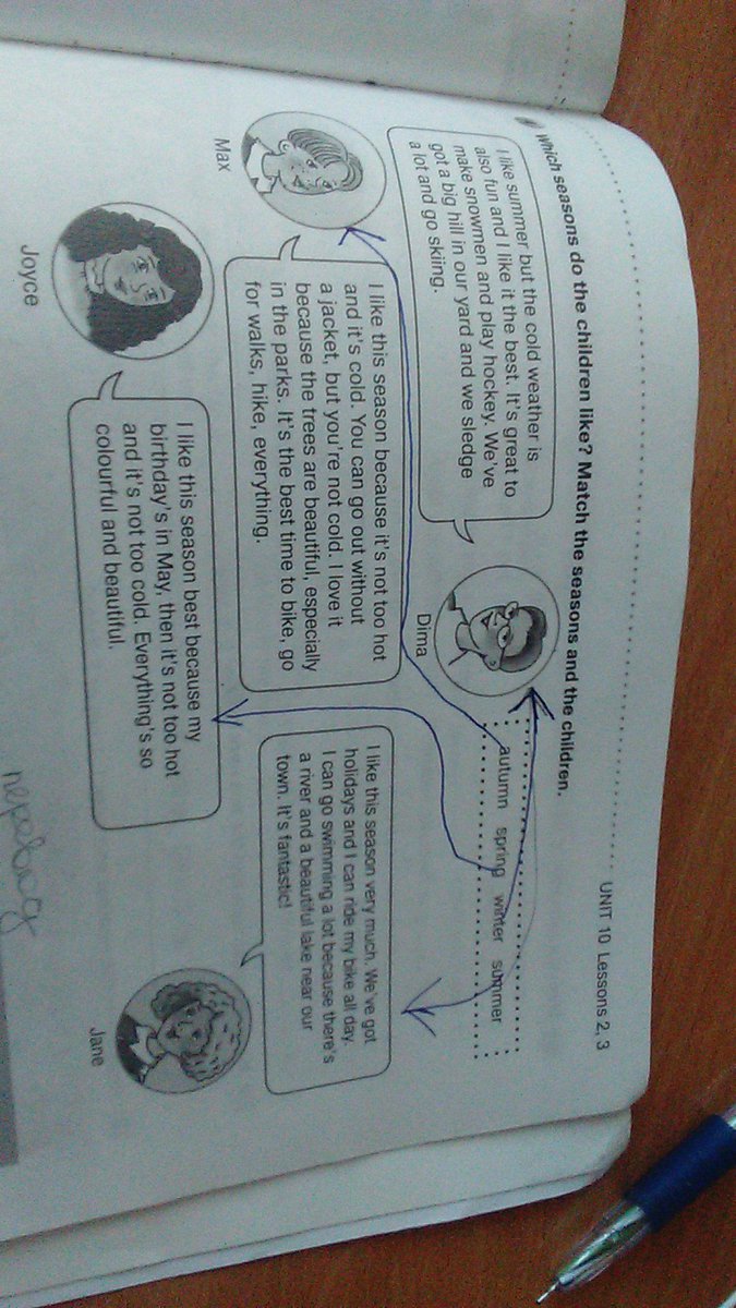 Макс. Мне нравится осень, потому что не слишком жарко и холодно. Ты можешь гулять без куртки, но тебе не будет холодно. Я люблю это, потому что деревья красивые, особенно в парках. Это лучше время для велосипеда, прогуливаться, походы, всё.
