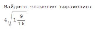 (1 9/16)^1/4 = (25/16) ^1/4 = ((5/4)^2)^1/4 = (5/4) ^(2*1/4) = (5/4)^ 1/2 = 0.5 * 5^1/2