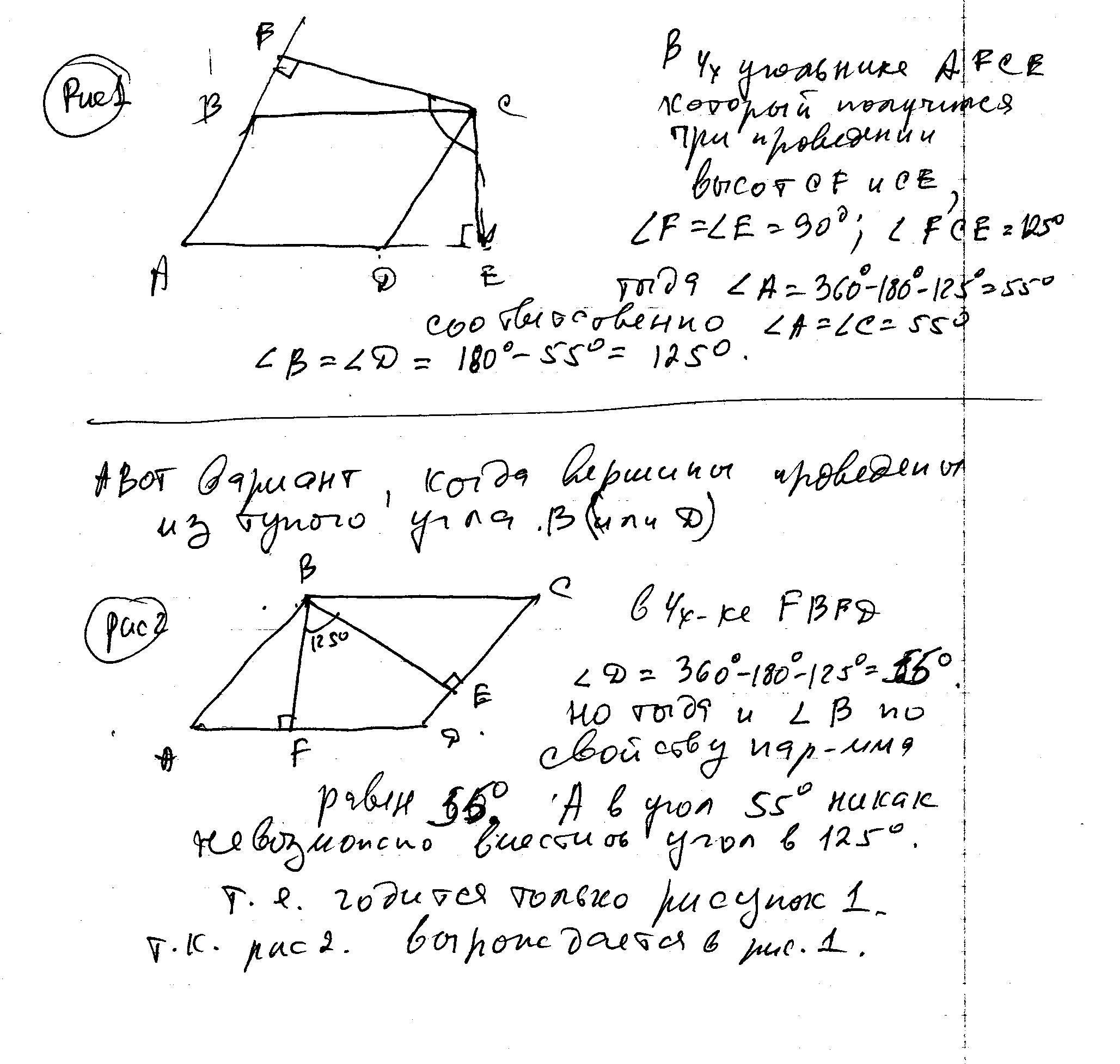 Угол между высотами параллелограмма, проведенными из одной вершины, равен 125 градусов. Найдите углы параллелограмма.