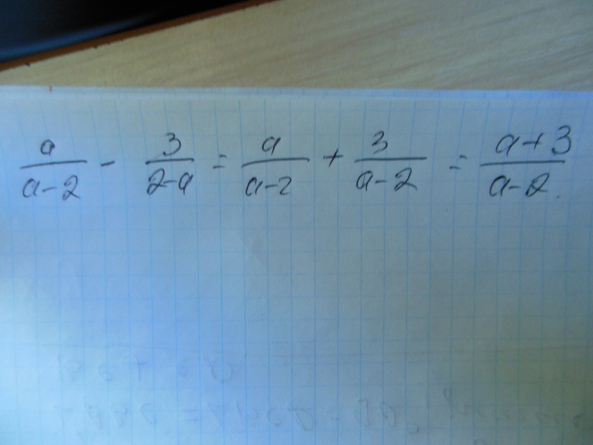 a / ( a - 2 ) - 3 / ( 2 - а ) = а / ( а - 2 ) + 3 / ( а - 2 ) = ( а + 3 ) / ( а - 2 )