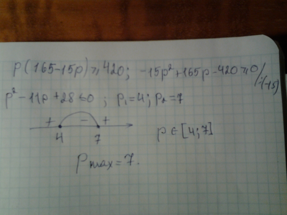 Определите максимальный уровень цены p, при котором значение выручки предприятия за месяц q*p составит не менее 420 тыс. руб.