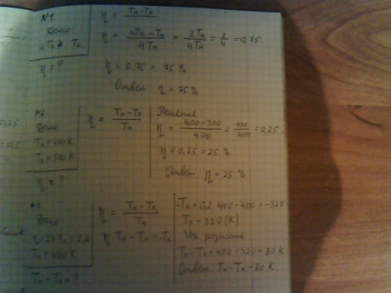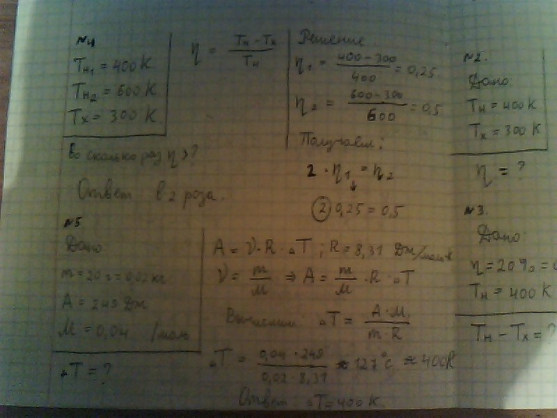 4. Во сколько раз увеличится КПД идеального теплового двигателя если температура нагреваетеля повысится от 400 до 600К? Температура холодильника 300 К.