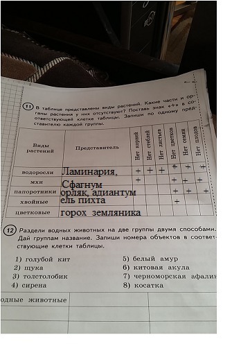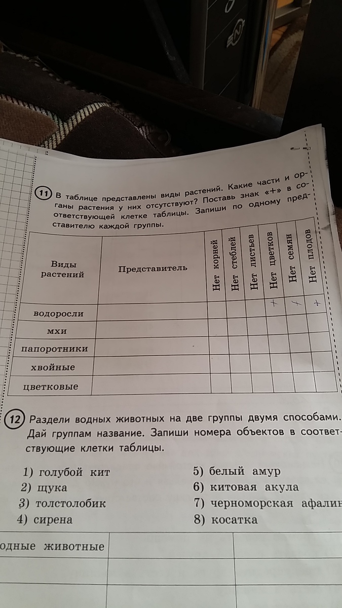 В таблице представлены виды растений. Какие части и органы растения у них отсутствуют? Поставь знак + в соответствующей клетке таблицы. Запиши по одному представителю каждой группы