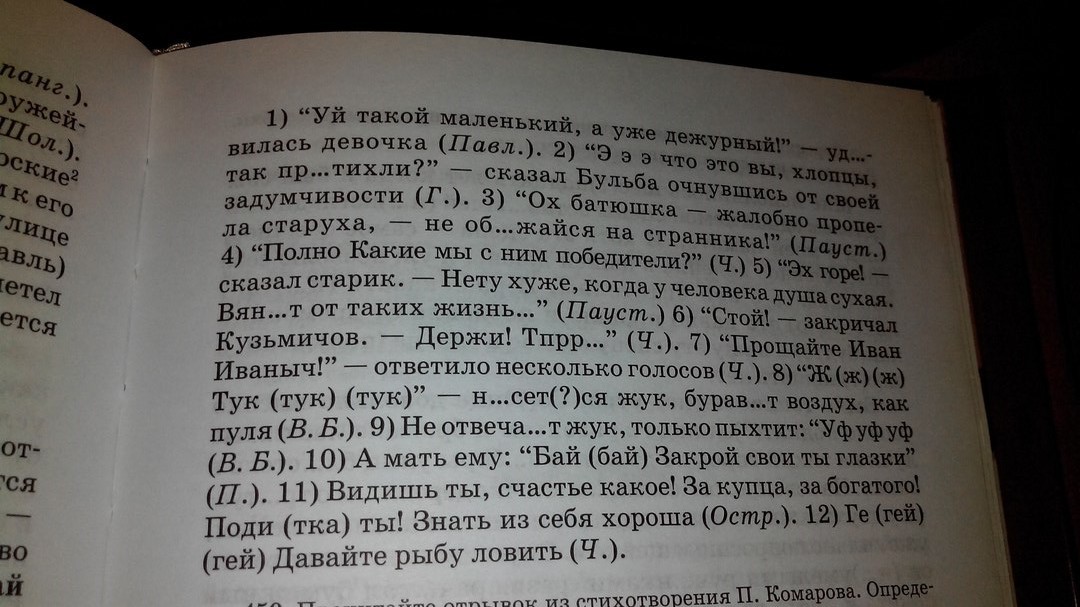 1) "Уй, такой маленький, а уже дежурный", -удивилась девочка. 2)"э-э-э, что это вы, хлопцы, так притихли?", - сказал Бульба, очнувшись от своей задумчивости. 3)ох, батюшка,- жалобно прошептала старуха,- не обижайся на странника. 4) Полно! Какие мы с ним победители?5) "Эх, горе,- сказал старик.- Нету хуже, когда у человека душа сухая. Вянет от таких жизнь..." 6) "Стой!- закричал Кузьмичев.- Держи!! Тпрр..." 7)Прощайте, Иван Иванович", - ответило несколько голосов. 8) " Жжж! Тук-тук-тук!"- несется жук, буравит воздух, как пуля. 9) Не отвечает жук, только пыхтит:"уф-уф-уф". 10) А мать ему: "Бай-бай! Закрой свои ты глазки!". 11) Видишь ты, счастье какое! За купца, за богатого! Поди- тка ты! Знать, из себя хороша! 12) Ге- гей- гей! Давайте рыбу ловить. Производные междометия: полно от наречия, прощайте, видишь, знать- от глагола,