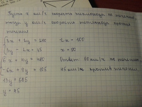 Теплоход проходит за 3 часа по течению и 2 часа против течения 240 км. Этот же теплоход за 3 часа против течения проходит на 35 км больше, чем за 2 часапо течению. Найдите скорость теплохода против течения и его скорость по течению.