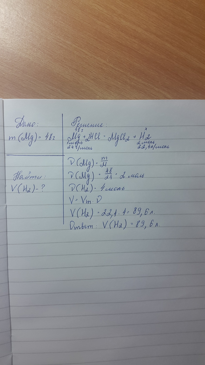 расчитайте объем водорода полученного при взаимодействии 48 г магния с соляной кислотой . (решите пожалуйста с ДАНО И РЕШЕНИЯ ) заранее спасибо.