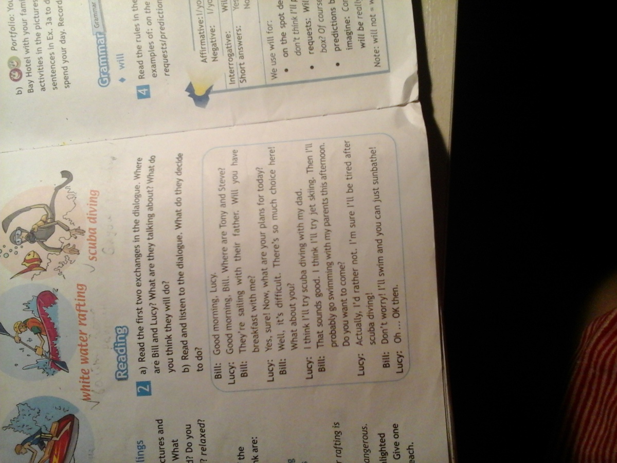 Прочитайте первые два обмены в диалоге, где находятся Билл и Люси? О чем они говорят? Как вы думаете, они будут делать? б) читать и слушать диалог. Что они решают сделать? Билл: Доброе утро, Люси. Люси: Доброе утро, Билл. Где Тони и Стив? Билл: Они парусные со своим отцом, ты завтракать со мной? на сегодня? Люси: Да, surel Теперь, каковы ваши планы Билл: Ну, это трудно. Там так много выбор здесь! А как насчет отца. Люси: Я думаю, что я буду попробовать подводное плавание с моим лыжам. Тогда я буду Билл: Это звучит хорошо. Я думаю, что я буду стараться реактивный самолет во второй половине дня. вероятно, пойти купаться с родителями Вы хотите приехать? l'U устать после того, как Люси: На самом деле, я предпочел бы не. Я уверен, что подводное плавание! вы можете просто загорают! Билл: Не волнуйтесь! Я буду плавать и Люси: о порядке тогда.