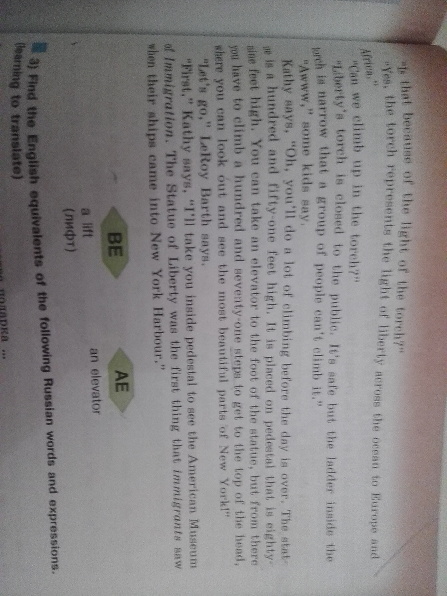 "Сперва," - ответила Кэти, "Я возьму вас с собой в пьедестал, чтобы посмотреть Американский Музей Иммиграции. Статуя Свободы была первой вещью, которую иммигранты увидели, когда их корабли прибыли к порту Нью-Йорка."
