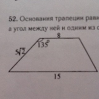 Основания трапеции равны 8 и 15, одна из боковых сторон равна 5 корень из 2, а угол между ней и одним из оснований равен 135 градусов. Найдите площадь трапеции