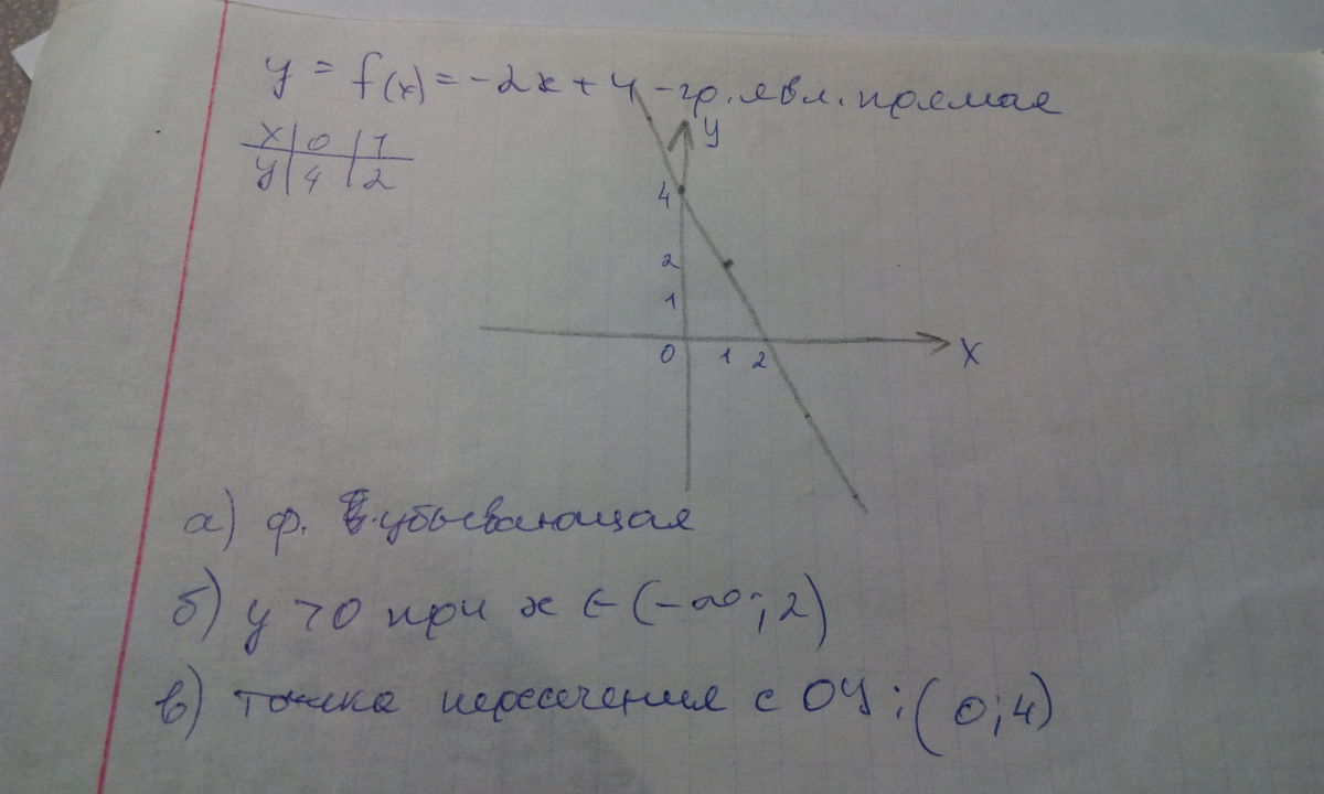 ДАЮ 50+ БАЛЛОВ!!! Начертите график функции y=f(x)=-2x+4. Пользуясь графиком, установите: а) возрастающая или уменьшающаяся? б) значения Х, при которых у>0; в) координаты точки, в которой график функции пересекает ось OY.