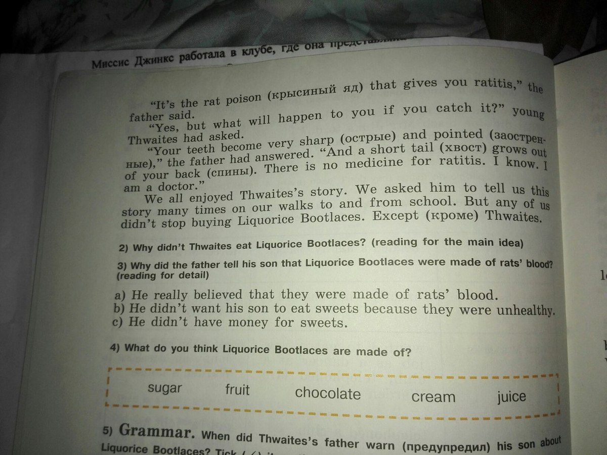 Твейтс сказал мне, что я не должен больше есть Liquorice Bootlaces. Отец Твейтса был доктором. Он сказал ему, что эти конфеты сделаны из крысиной крови. Отец много чего рассказал сыну об этих конфетах. "Каждый крысолов в этой стране", - говорил он, - " относит своих крыс на фабрику, где производятся Liquorice Bootlaces, и они платят за каждую крысу. Многие крысоловы стали миллионерами, продавая крыс на эту фабрику."
