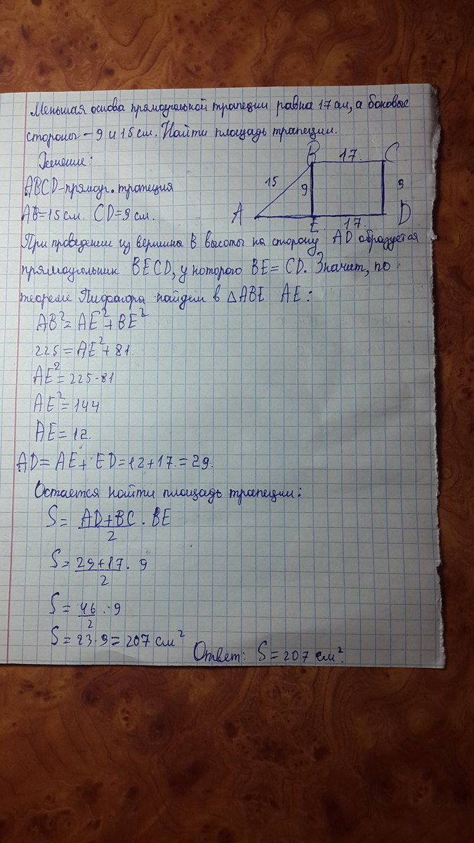 меньшая основа прямоугольной трапеции равна 17 см, а боковые стороны 9 см и 15 см .Найдите площадь трапеции