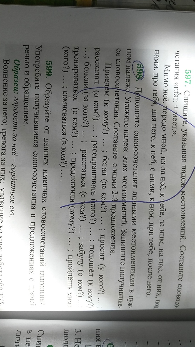 приедем к нему(д.падеж),бегал за ней(т.п.),просит у меня(р.п.),рассказал о них(п.п.),расспрашивать его(р.п.),подошёл к ним(д.п.),болели за него(р.п.), расстаться с ней(т.п ),забуду о нём(п.п.),тренироваться с ним(т.п.),предложили ему(д.п.),пойдёшь мимо меня(р.п.),сомневаться в нём(п.п.)