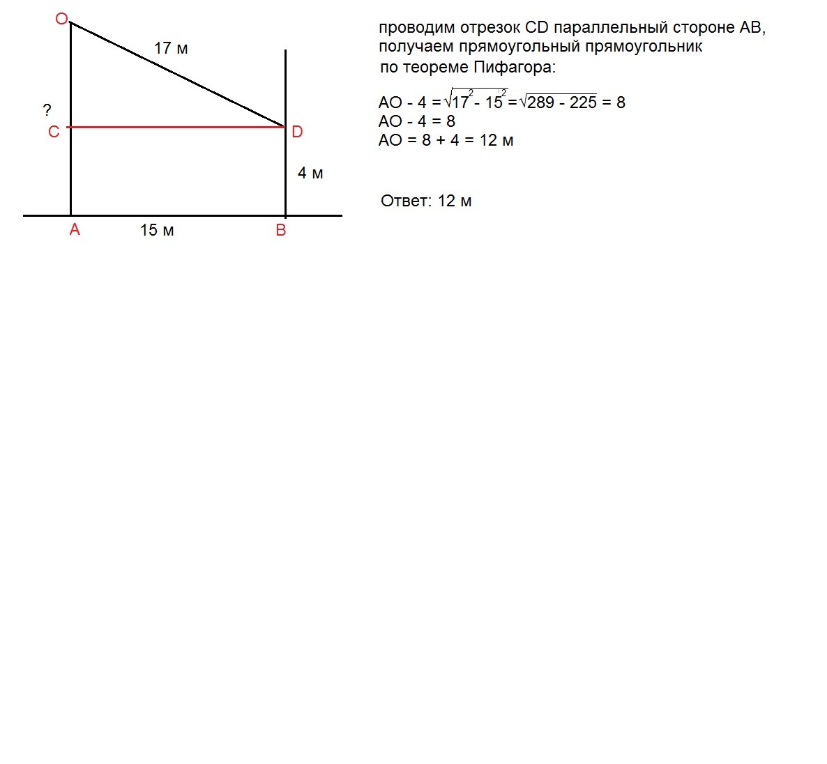 От столба к дому натянут провод длиной 17 м, который закреплён на стене дома на высоте 4 м от земли (см. рисунок). Вычислите высоту столба, если расстояние от дома до столба равно 15 м.
