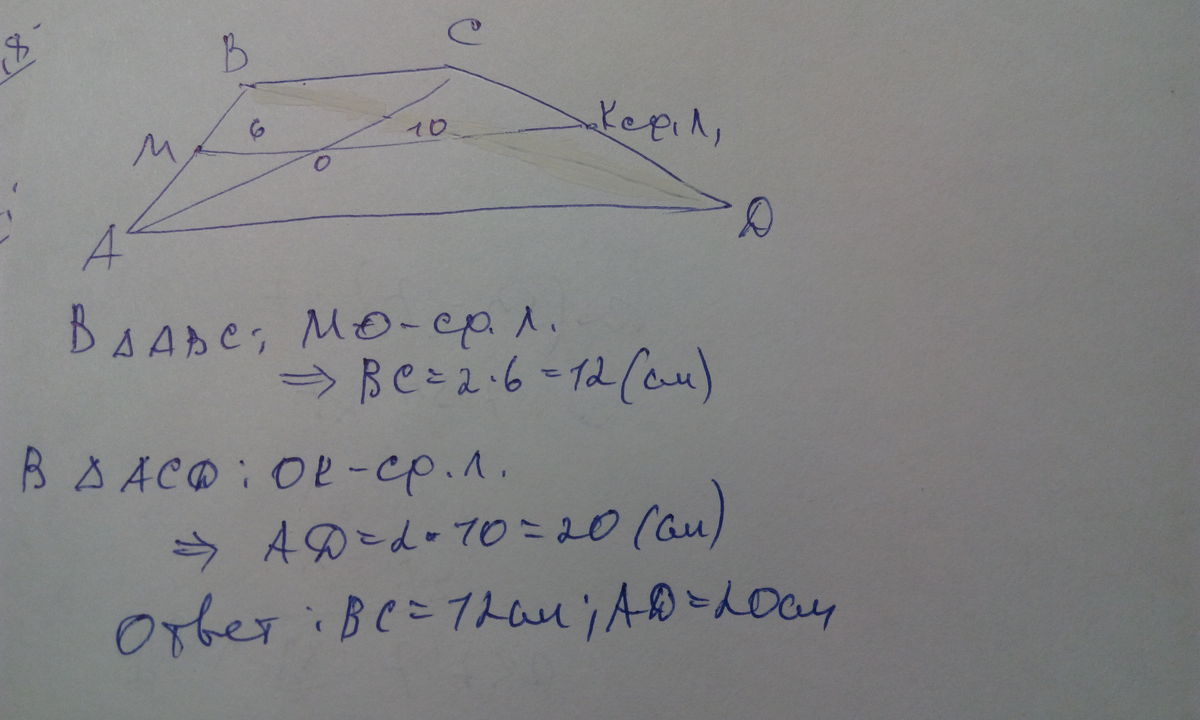 Диагональ трапеции делит её среднюю линию на отрезки, длины которых равны 6 и 10 см. Вычислите длины основания трапеции