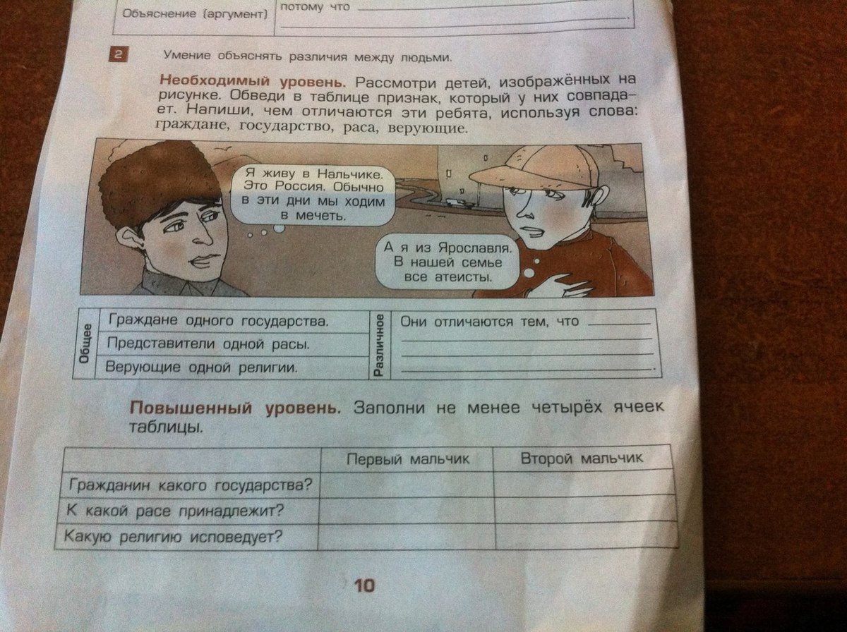 Обведи в таблице признак,который у них совпадает----оба мальчика граждане одного государства Напиши,чем отличаются эти ребята--разная религия, один верующий, а другой атеист