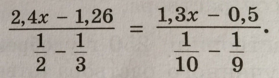 2,4х-1,26 / 1/2-1/3 = 1,3х-0,5 / 1/10 - 1/9