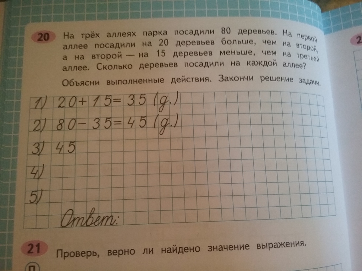 1) 20 +15=35 ( д.) -высажено больше деревьев на первой и третей аллеи чем на второй.
