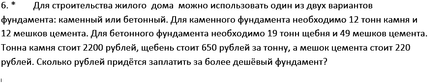 Каменный фундамент: 12 тонн камня (12* 2200) + 12 мешков цемента (12*220)= 26400+2640=29040.