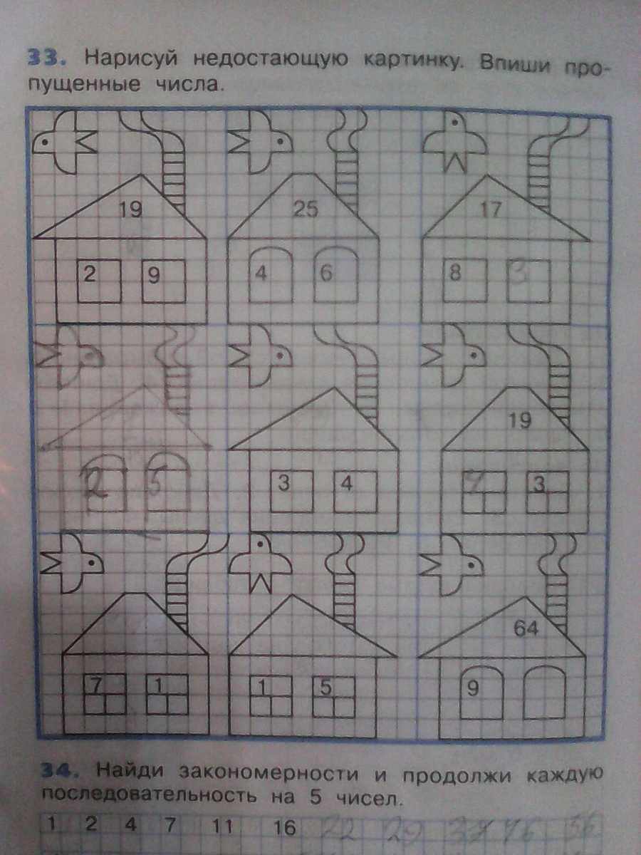 нарисуйте недостающую картинку. Впишите пропущенные числа.