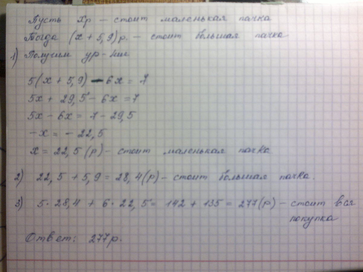 Купили 5 больших и 6 маленьких пачек масла, заплатив за все большие пачки на 7 рублей больше, чем за все маленькие. Найдите стоимость покупки, если одна маленькая пачка на 5,9 рублей дешевле большой.