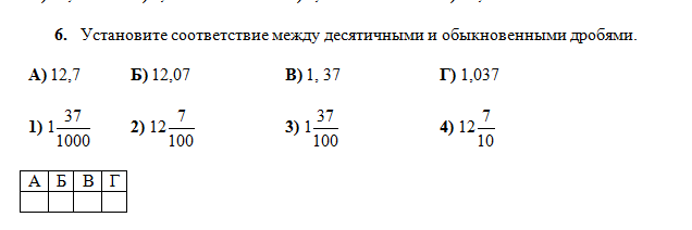 6. Установите соответствие между десятичными и обыкновенными дробями.