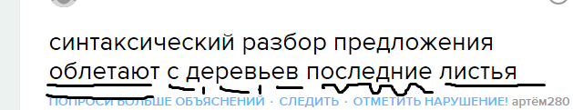 Повест., невоскл., прост., двусост., распр. Основа : облетают листья ( = - ). Определение : последние ( ~ ). Обстоятельство : с деревьев ( -/-/-/- )