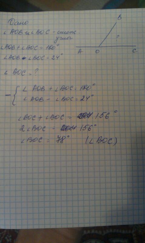 разность двух смежных углов равна 24°.Найдите меньший смежный угол