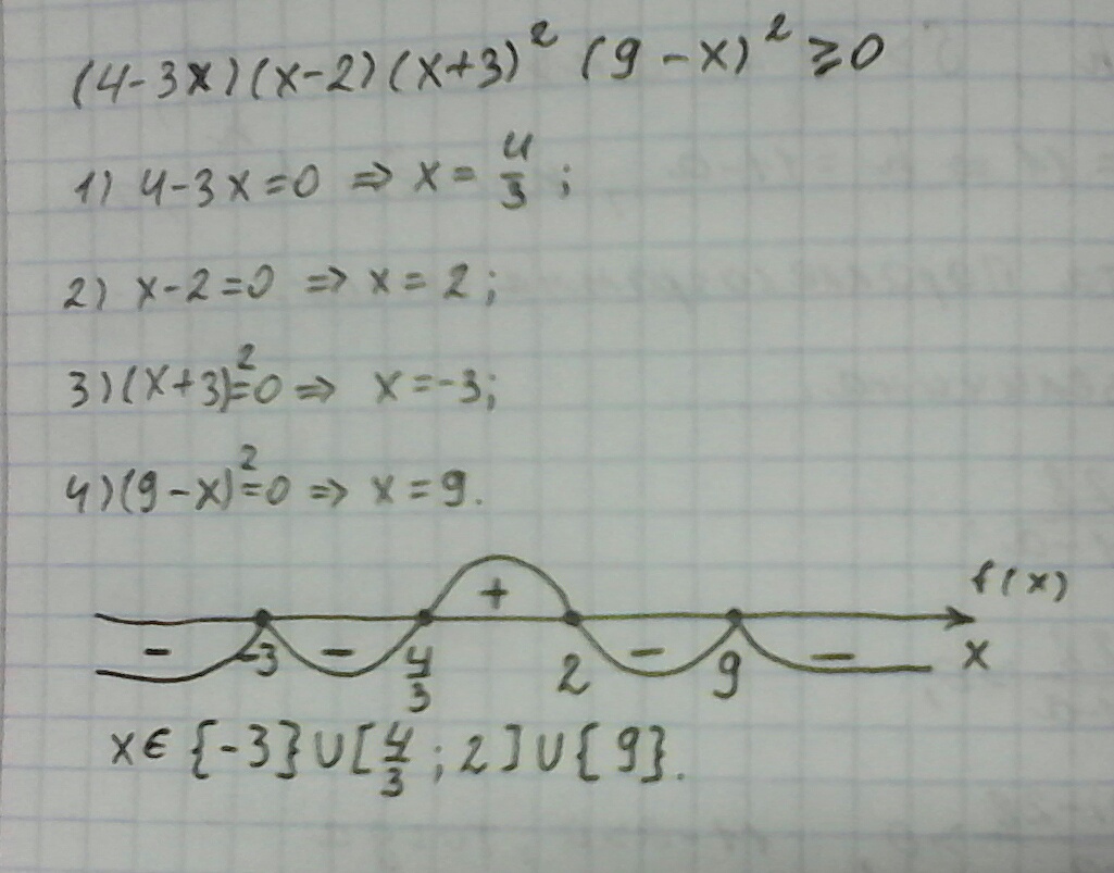 (4-3x)(x-2)(x+3)^2(9-x)^2>=0