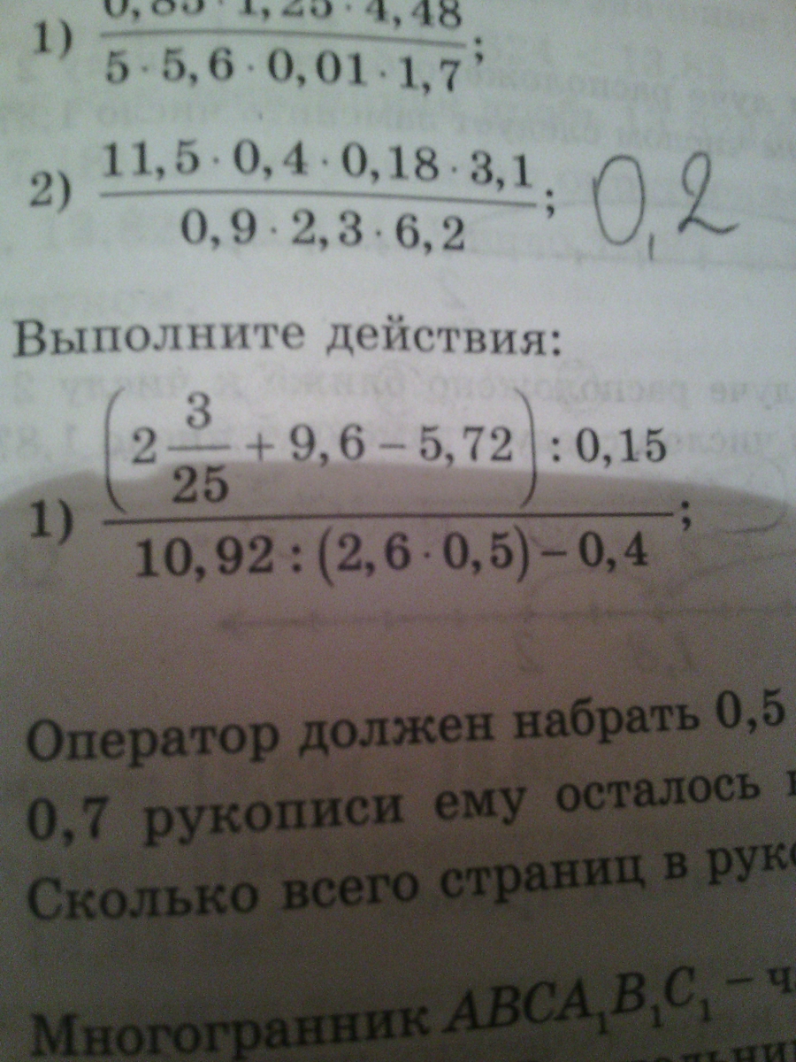 2³/₂₅=2,12. Теперь числитель равен (2,12+9,6-5,72):0,15=6:0,15=600/15=40. Знаменатель 10,92:1,3-0,4=8,4-0,4=8. Теперь делим числитель на знаменатель 40/8=5.