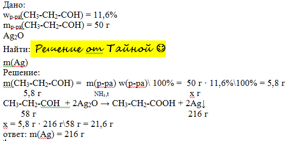 Определить массу серебра, которое будет получено, если к избытку аммиачного раствора оксида серебра прибавить 50 г 11,6 %-ного водного раствора пропаналя. (Ответ: 21,6 г).