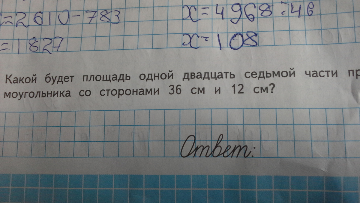 Какой будет площадь одной двадцать седьмой части прямоугольника со сторонами 36 см и 12 см?