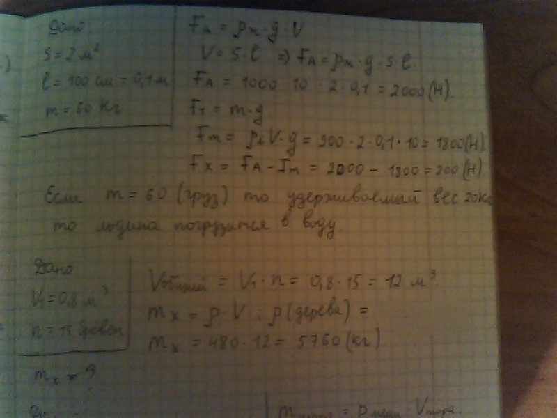 1) Погрузится ли целиком в воду льдина площадью 2 м2 и толщиной 100 см, если на нее встанет человек массой 60 кг?