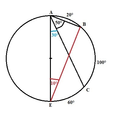 Дуга АЕ равна сумме дуг АВ,ВС и СЕ. Тогда дуга СЕ=180°-20°-100°=60°, а вписанный угол САЕ, опирающийся на эту дугу, равен половине ее градусной меры, то есть