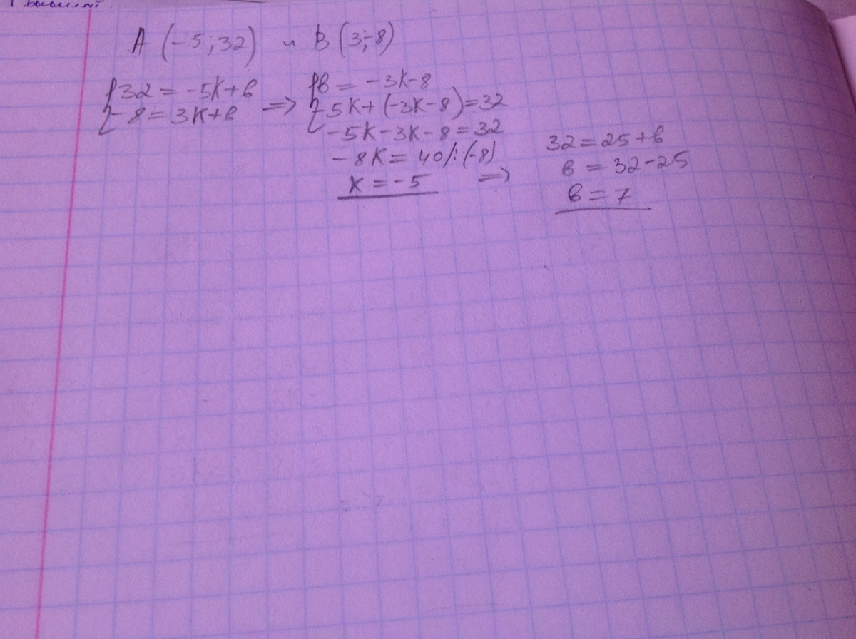 График линейной функции проходит через точки А(-5;32) и В(3;-8). Задайте эту линейную функцию формулой.