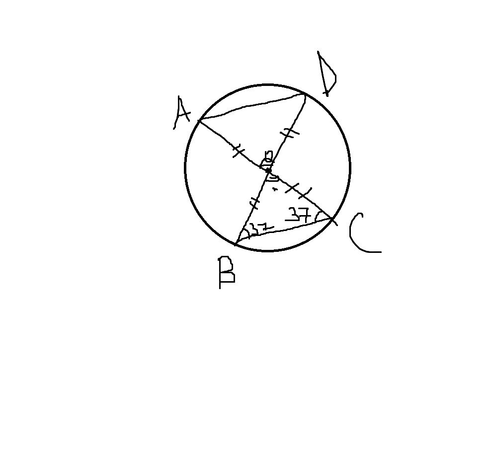 при пересечении диаметры делятся пополам, следовательно все получившиеся отрезки равны как радиусы. дочертим две хорды BC и AD, это будут основания получившихся треугольников. эти треугольники равнобедренные, следовательно углы при основании равны. третий угол в треугольнике BOC найдем по формуле: 180-(37+37)= 106 градусов. Этот третий угол, кстати, вертикален углу AOD, следовательно они равны. Ответ: 106 градусов.