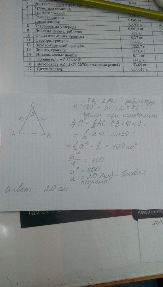 угол при вершине противолежащей основанию равнобедренного треугольника равен 30 площадь треугольника равна 100 найти боковую сторону