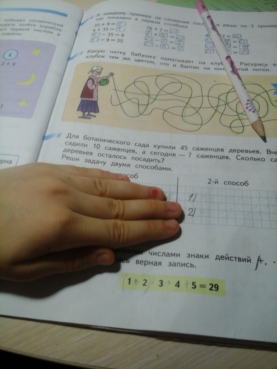для ботанического сада купили 45 саженцев деревьев . Вчера посадили 10 саженцев а сегодня 7 саженцев . Сколько саженцев деревьев осталось посадить ? реши задачу двумя способами.