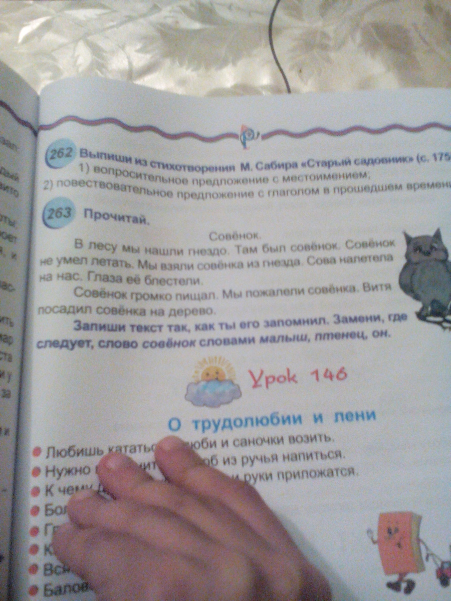 В лесу мы нашли гнездо, в которым был совенок. Он не умел летать. Мы решили взять птенца с собой, но на нас налетела сова. У нее блестели глаза. Малыш громко пищал и мы пожалели его. Витя посадил малыша обратно на дерево.