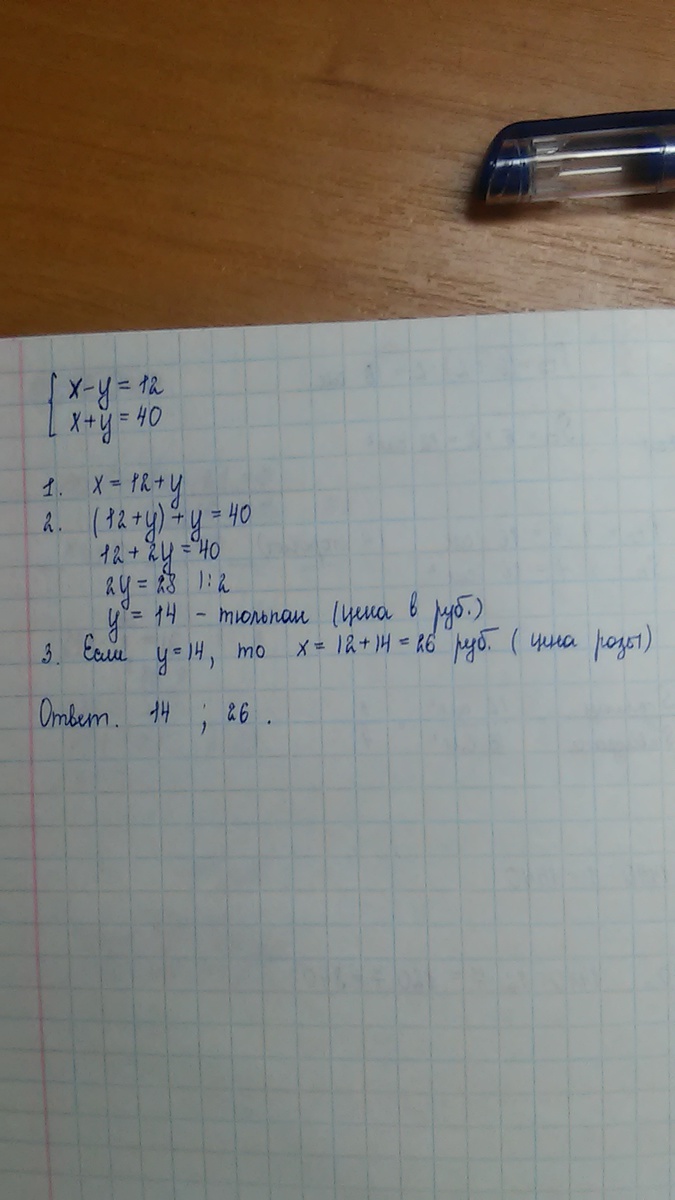 реши задачу с помощью уравнения. тюльпан дешевле розы на 12 руб. Сколько стоит тюльпан и сколько раза, если вместе они стоят 40 руб