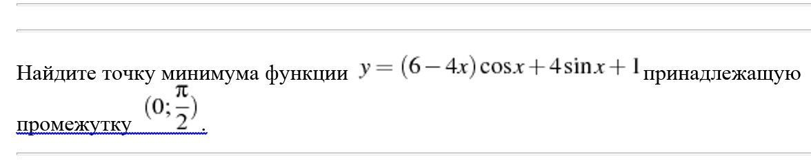 Если y(x)=(6-4*x)*cos(x)+4*sin(x)+1, то y'(x)=-4*cos(x)-(6-4*x)*sin(x)+4*cos(x)=(4*x-6)*sin(x). Приравнивая производную нулю, получаем уравнение (4*x-6)*sin(x)=0. Отсюда либо 4*x-6=0, либо sin(x)=0. Из первого уравнения находим x=3/2, из второго уравнения - x=k*π, где k - любое целое число. Но промежутку (0;π/2) из рассмотренных значений принадлежит только значение x=3/2. Пусть x<3/2 - например, пусть x=1. Тогда f'(1)=(4-6)*sin(1)<0, так что на интервале (0;3/2) функция убывает. Пусть теперь x>3/2 - например, пусть x=2. Тогда f'(2)=2*sin(2)>0, так что на интервале (3/2;π) функция возрастает. Значит, точка x=3/2 является точкой минимума функции.