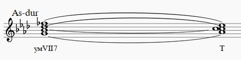 умVII7 в мажоре строится в гармоническом виде, состоит из ум.53+м.3 и разрешается в тоническое трезвучие с удвоенной терцией.