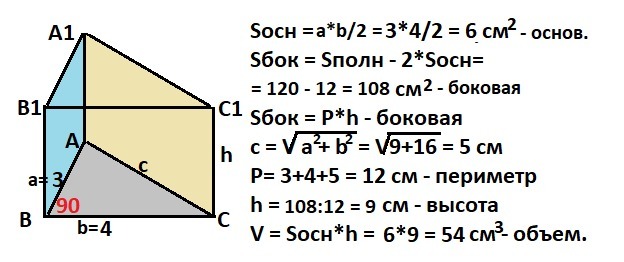 Основание прямой призмы - прямоугольный треугольник с катетами 3 и 4 см. Площадь полной поверхности призмы равна 120 см^2. Найдите объем призмы.
