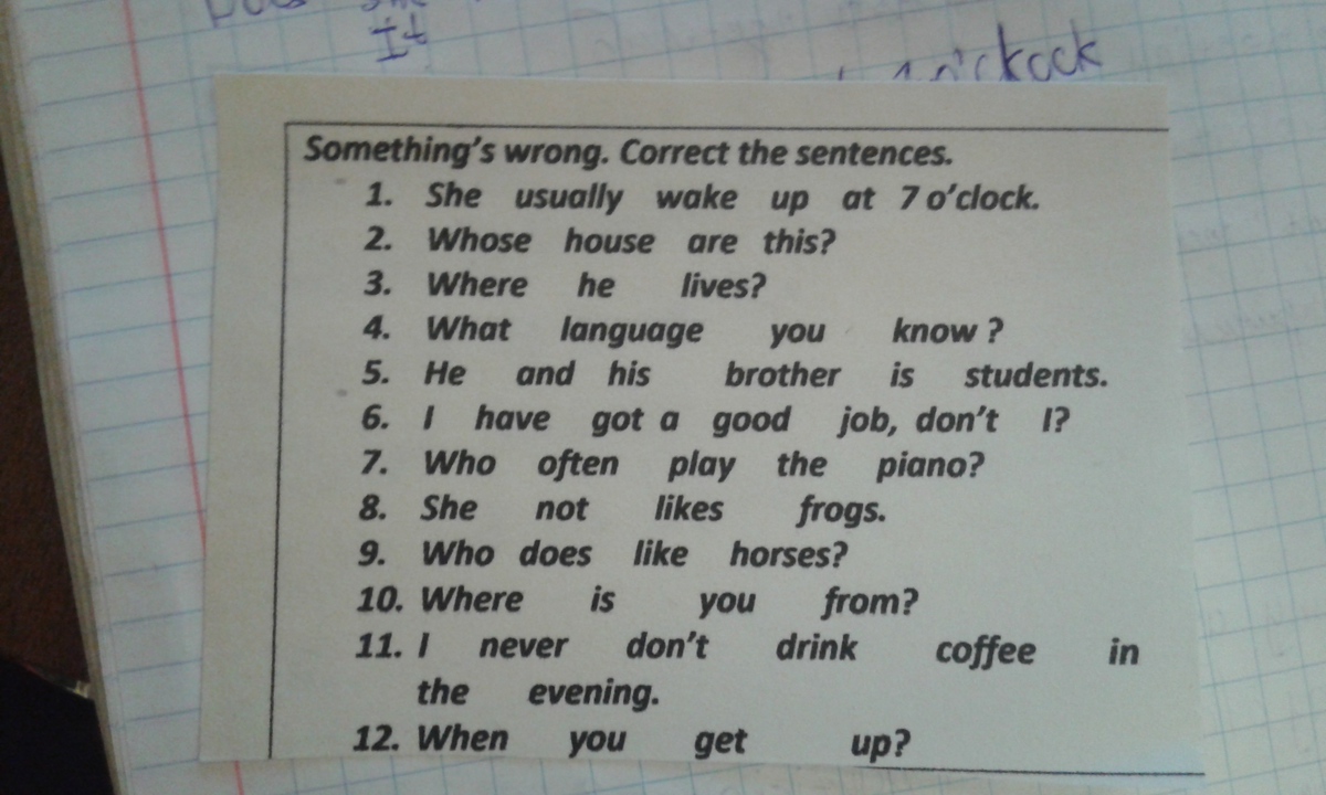 1)wakes 2)whose house is this 3)where does he live 4)what language do you know 5)are students 6)...,haven't I 7)who often plays ...8)she does not like 9)who likes ...10)where are...11)I never drink coffee in the evening 12)when do you get up